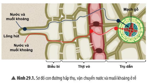Câu 2: Quan sát Hình 29.1, em hãy mô tả con đường hấp thụ, vận chuyển nước và muối khoáng từ môi trường đất vào mạch gỗ của rễ.