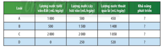 Loài B và loài C được cung cấp nước ít hơn so với nhu cầu của cây nên cây bị héo và có thể bị chết.
