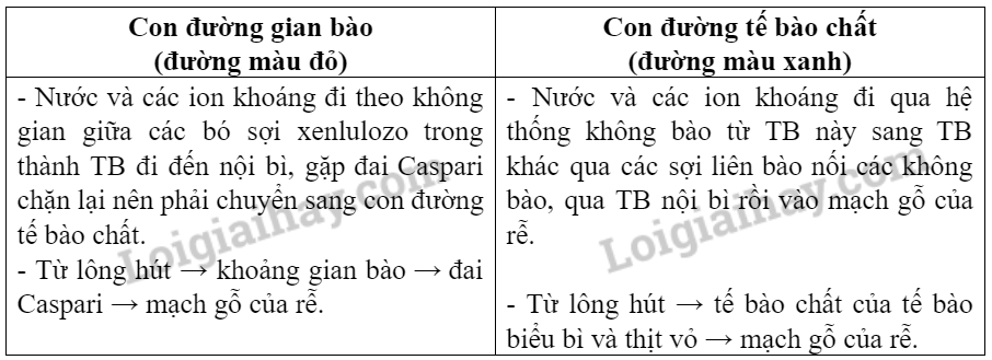 Nước và muối khoáng từ đất được rễ hấp thụ vào mạch gỗ nhờ lông hút, sau đó, được vận chuyển lên thân và lá để cung cấp cho các hoạt động sống của cây. Sự hấp thụ, vận chuyển nước muối khoáng từ môi trường đất vào mạch gỗ của rễ thông qua hai con đường là con đường gian bào và con đường tế bào chất.