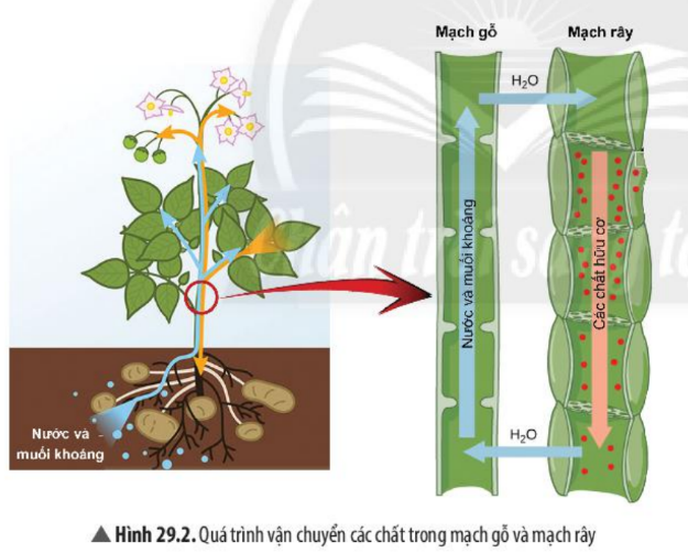 Câu 4: Quan sát Hình 29.2, em hãy cho biết chiều vận chuyển các chất trong mạch gỗ và mạch rây có gì khác nhau.