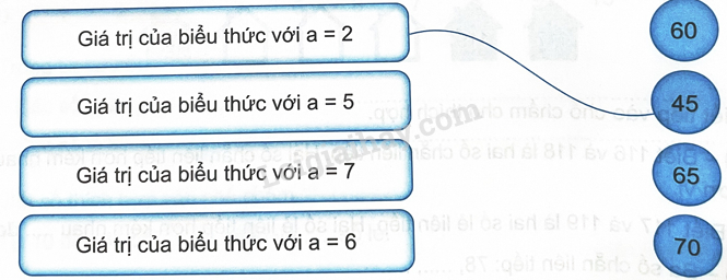 Nối giá trị của biểu thức 35 + 5 x a trong mỗi trường hợp với số thích hợp (theo mẫu)