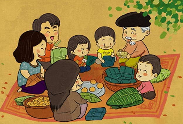 – Mọi người đều rất vui vẻ, quây quần cùng nhau gói bánh chưng.