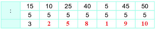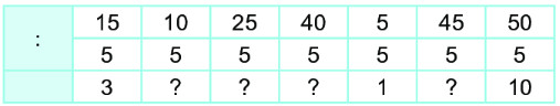 Tính nhẩm các phép tính dựa vào bảng chia 5 rồi viết kết quả vào ô có dấu “?” trong bảng.