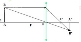 Ta có \(\Delta OAB \sim \Delta OA’B’ \Rightarrow \dfrac{{AB}}{{A’B’}} = \dfrac{{OA}}{{OA’}} \Leftrightarrow \dfrac{{10}}{{A’B’}} = \dfrac{{20}}{2} \Rightarrow A’B’ = 1cm\)