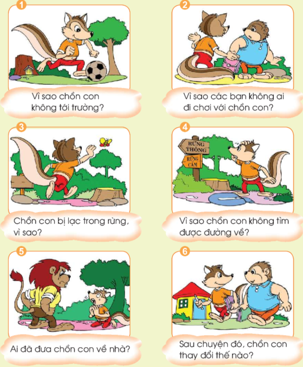 Có một chú chồn con đã tới tuổi đi học. Nhưng chú ta chỉ thích rong chơi, không chịu đến trường. Chồn rủ Nhím đi chơi. Nhím từ chối vì phải đi học. Các bạn thỏ, sóc, rùa cũng chẳng đi chơi với chồn, vì ai cũng bận tới trường. Thế là chồn đành đi chơi một mình. Mải mê đuổi theo đàn bướm, chồn ta càng lúc càng đi sâu vào rừng. Trời sắp tối, chồn muốn về nhà nhưng không tìm được đường ra. Trong rừng có bảng chỉ dẫn đường, nhưng chồn không biết chữ. Chồn con vừa sợ vừa hối hận vì đã không chịu đi học. Giữa lúc ấy, bác sư tử đi làm về, thấy chồn con sắp khóc, bác sư tử hỏi: