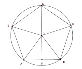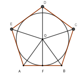 Gọi \(O\) là tâm đường tròn nội tiếp ngũ giác đều \(ABCDE\), đường cao \(OF \bot AB.\)