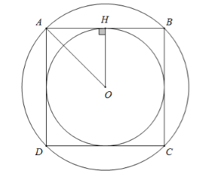 Chứng minh bán kính đường tròn ngoại tiếp và nội tiếp hình vuông là cạnh huyền và cạnh góc vuông của một tam giác vuông cân, từ đó suy ra tỉ lệ