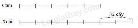 Số cây cam trong vườn ít hơn số cây xoài là 32 cây. Tỉ số của số cây xoài và số cây cam là $\frac{7}{5}$. Hỏi trong vườn có bao nhiêu cây xoài, bao nhiêu cây cam?