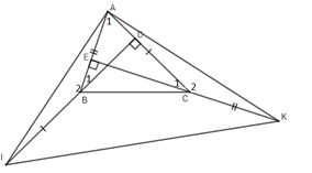Cho \(\Delta ABC\) nhọn, hai đường cao BD và CE. Trên tia đối của tia BD lấy điểm I sao cho \(BI = AC\). Trên tia đối của tia CE lấy điểm K sao cho\(CK = AB.\)