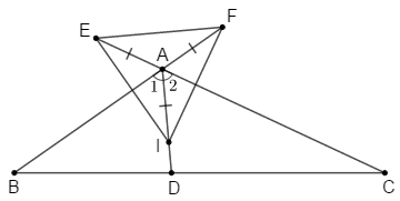 Cho tam giác \(ABC\) có: \(\widehat B + \widehat C = {60^0}.\) Trên đường phân giác \(AD\) của góc \(A\) lấy điểm \(I.\) Trên tia đối của tia \(AB\) lấy điểm \(F\) sao cho \(AF = AI.\) Trên tia đối của tia \(AC\) lấy điểm \(E\) sao cho \(AE = AI.\)