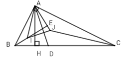 Cho \(\Delta ABC\) vuông tại A, đường cao AH, phân giác AD. Gọi I, J lần lượt là giao điểm các phân giác của \(\Delta ABH\), \(\Delta ACH\), E là giao điểm của đường thẳng BI và AJ. Chọn câu đúng.