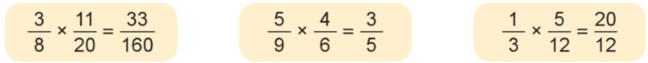 $\frac{5}{9} \times \frac{4}{6} = \frac{3}{5}$     ;      $\frac{1}{3} \times \frac{5}{{12}} = \frac{{20}}{{12}}$