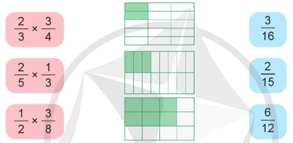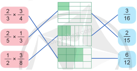 b) Ghép thẻ ghi phép nhân phân số với thẻ hình và thẻ ghi kết quả thích hợp theo quy tắc: Muốn nhân hai phân số, ta lấy tử số nhân với tử số, mẫu số nhân với mẫu số.