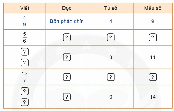 – Viết: Mỗi phân số có tử số và mẫu số. Số viết trên gạch ngang là tử số, số viết dưới gạch ngang là mẫu số