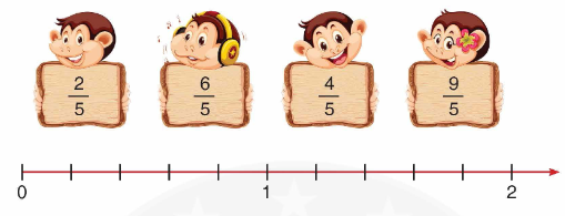 – Đếm thêm $\frac{1}{5}$ rồi xác định vị trí của mỗi phân số đã cho trên tia số