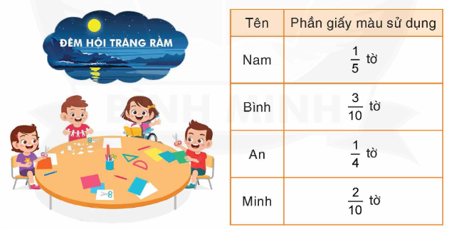Để trang trí cho “Đêm hội trăng rằm”, bốn bạn Nam, An, Bình, Minh đã sử dụng phần giấy màu được ghi trong bảng dưới đây: