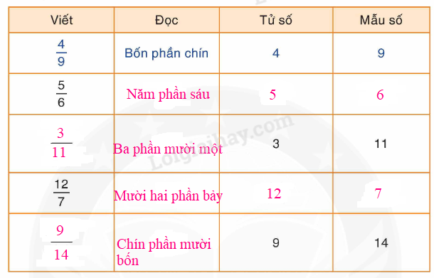 – Viết: Mỗi phân số có tử số và mẫu số. Số viết trên gạch ngang là tử số, số viết dưới gạch ngang là mẫu số