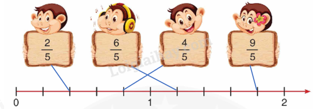– Đếm thêm $\frac{1}{5}$ rồi xác định vị trí của mỗi phân số đã cho trên tia số