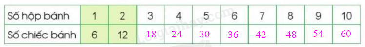 – Để tính số chiếc bánh ta lấy số hộp bánh nhân với 6.