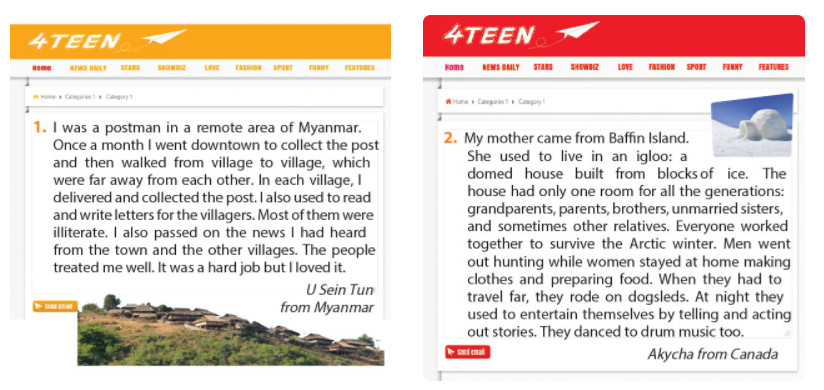 1. Tôi là một người đưa thư ở vùng xa xôi của Myanmar. Mỗi tháng một lần, tôi đến trung tâm thành phố để lấy bưu kiện và sau đó đi bộ từ làng này đến làng khác, những nơi cách xa nhau. Ở mỗi làng, tôi giao và nhận bưu kiện. Tôi cũng thường đọc và viết thư cho dân làng. Đa số họ mù chữ. Tôi cũng thông báo những tin tức tôi đã nghe từ thị trấn và những ngôi làng khác. Mọi người đối xử tốt với tôi. Nó là một công việc khó khăn nhưng tôi yêu thích nó.
