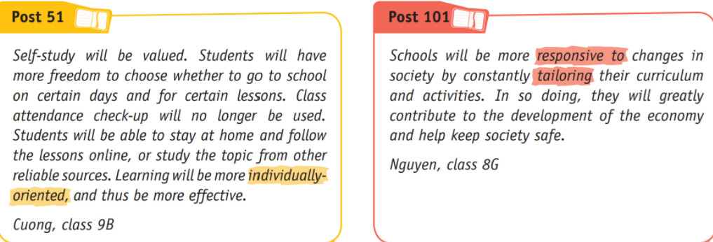 2. Work in groups. Look at the coloured words/ phrases in the posts. Then discuss and find their meanings from the context.