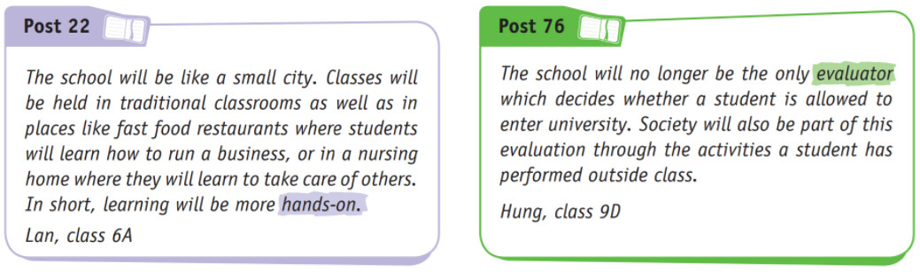 Bài viết 22: Trường học sẽ giống như một thành phố nhỏ. Các lớp học sẽ được tổ chức trong những lớp học truyền thống cũng như ở những nơi như nhà hàng thức ăn nhanh nơi học sinh sẽ học cách để hoạt động kinh doanh, hoặc trong viện dưỡng lão nơi họ sẽ học cách chăm sóc người khác. Tóm lại, học sẽ thiết thực hơn.