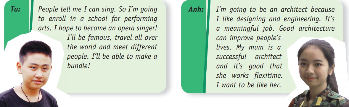 (Làm việc theo cặp. Nói với bạn cùng học về công việc mà bạn muốn/ không muốn làm trong tương lai. Nhớ nêu lý do tại sao hoặc tại sao không.)