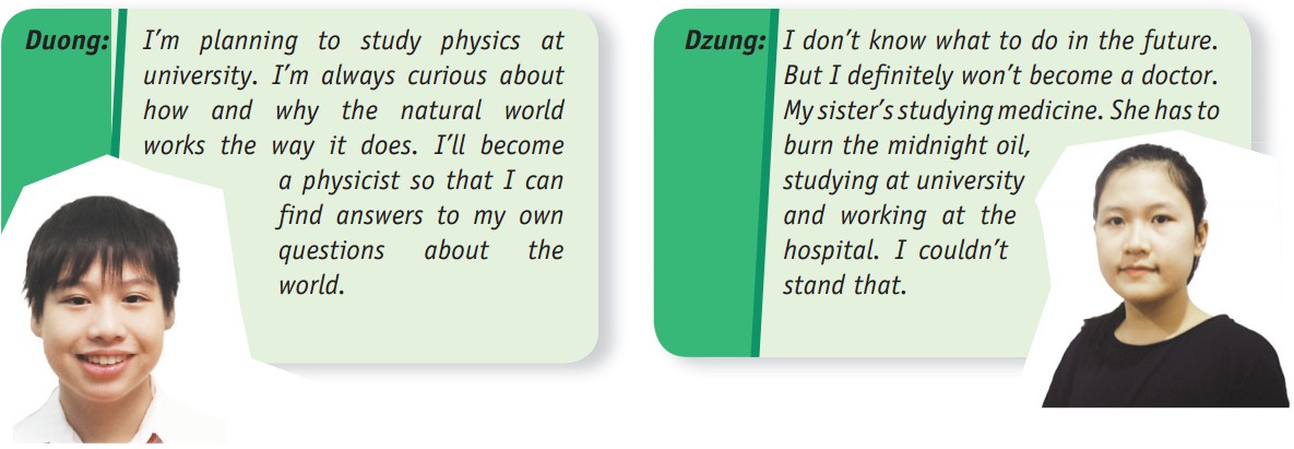 Dương: Mình dự định học vật lý ở trường đại học. Mình luôn tò mò về cách thức và thế giới tự nhiên hoạt động theo cách của nó. Mình sẽ  trở thành một nhà vật lý để tìm ra câu trả lời cho những câu hỏi của riêng mình về thế giới.