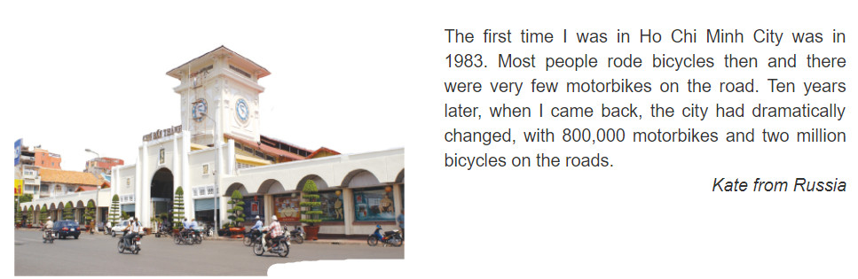 Kate comes from Russia. She said that the first time she had been in Ho Chi Minh city was in 1983. Most people travelled by bike and there are a few motorbikes on the streets. After a decade, she came back and realized that the city had been changed a lot with nearly 1 billion motorbikes and 2 million bikes on the road.