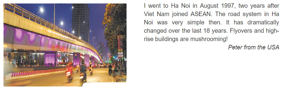 –   Peter is from America. He said that he had gone to Ha Noi in 1997 when Viet Nam had been part of ASEAN for two years. He was shocked/astonished to see that so much had changed over the last 18 years. The flyovers and high-rise buildings were mushrooming.
