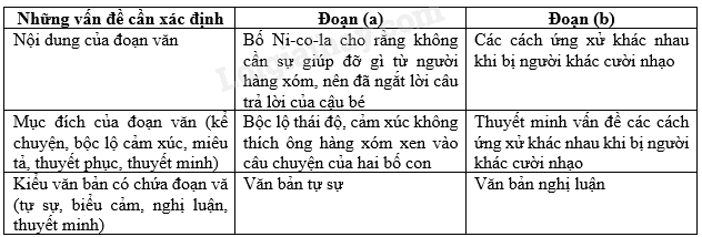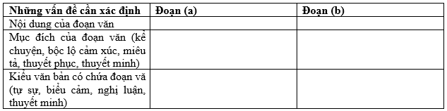 Sau đây là hai đoạn văn có mục đích giao tiếp khác nhau. Kẻ bảng vào vở theo mẫu và điền các thông tin thể hiện sự khác nhau giữa hai đoạn văn.