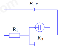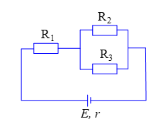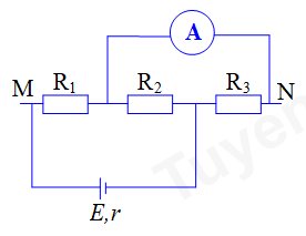 Cho mạch điện như hình vẽ. Bỏ qua điện trở của dây nối và ampe kế\(E = 30V;{\mkern 1mu} {\mkern 1mu} r = 6\Omega ;{\mkern 1mu} {\mkern 1mu} {R_1} = 12\Omega ;{\mkern 1mu} {\mkern 1mu} {R_2} = 36\Omega ;{\mkern 1mu} {\mkern 1mu} {R_3} = 18\Omega \). Xác định số chỉ ampe kế: