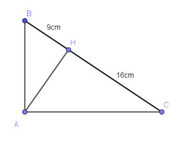 \(\begin{array}{l} + )A{H^2} = BH.HC \Rightarrow AH = \sqrt {9.16} = 12\\ + )A{C^2} = CH.BC = CH.\left( {CH + BH} \right) \Rightarrow AC = \sqrt {16.\left( {9 + 16} \right)} = 20\end{array}\)