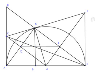 Xét nửa đường tròn tâm O đường kính AB có AC và MC là hai tiếp tuyến giao nhau tại M với M,A là tiếp điểm\( \Rightarrow AC = MC\)(tính chất tiếp tuyến)