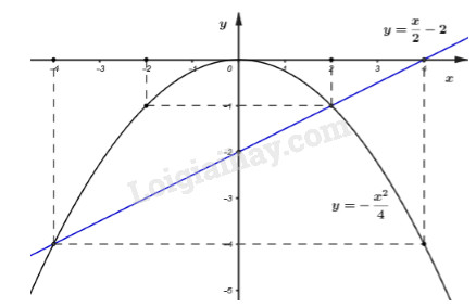 Vậy đồ thị hàm số \(\left( P \right):\,\,\,y = – \dfrac{{{x^2}}}{4}\) là đường cong đi qua các điểm \(\left( { – 4; – 4} \right),\,\,\left( { – 2; – 1} \right),\,\)\(\left( {0;\,0} \right),\,\,\left( {2; – 1} \right),\,\,\left( {4; – 4} \right).\) +) Vẽ đồ thị hàm số \(\left( d \right):\,\,y = \dfrac{x}{2} – 2:\)