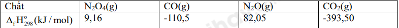 \(\begin{array}{l}{\Delta _r}H_{298}^o = {\Delta _f}H_{298}^o({N_2}{\rm{O) + 3}}{\Delta _{\rm{f}}}{\rm{H}}_{298}^o(C{O_2}) – 3{\Delta _f}H_{298}^o(CO) – {\Delta _f}H_{298}^o({N_2}{{\rm{O}}_4})\\ = 82,05 + 3.( – 393,5) – 3.( – 110,5) – 9,16 =  – 776,11kJ\end{array}\)