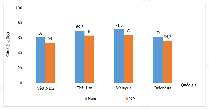 Câu 10: Cho bảng thống kê về cân nặng trung bình (đơn vị: ki-lô-gam) của nam, nữ tại một số quốc gia Đông Nam Á như sau: