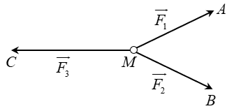 Câu 15: Cho ba lực \(\overrightarrow {{F_1}} {\rm{ \;}} = \overrightarrow {MA} \), \(\overrightarrow {{F_2}} {\rm{ \;}} = \overrightarrow {MB} \), \(\overrightarrow {{F_3}} {\rm{ \;}} = \overrightarrow {MC} \) cùng tác động vào một vật tại điểm \(M\) và vật đứng yên. Cho biết cường độ của \(\overrightarrow {{F_1}} \), \(\overrightarrow {{F_2}} \) đều bằng 50N và góc \(\widehat {AMB} = {60^^\circ }\). Khi đó cường độ lực \(\overrightarrow {{F_1}} \) của là
