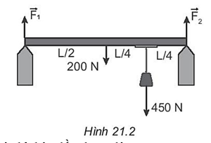 Câu 4: Một thanh đồng chất có chiều dài L, trọng lượng 200 N, treo một vật có trọng lượng 450 N vào thanh như Hình 21.2. Các lực \(\overrightarrow {{F_1}} ,\overrightarrow {{F_2}} \) của thanh tác dụng lên hai điểm tựa có độ lớn lần lượt là