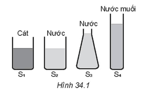 Câu 24: Trong thí nghiệm vẽ ở Hình 34.2, ban đầu cân thăng bằng. Sau đó nhúng đồng thời cả hai vật chìm trong nước ở hai bình khác nhau. Phương án nào sau đây là đúng?