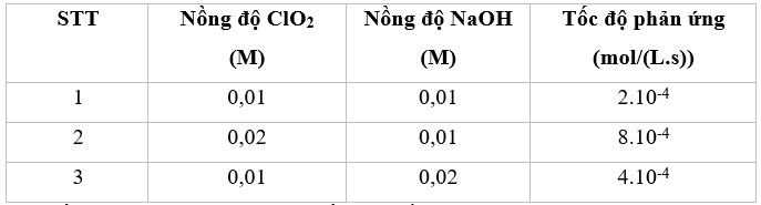 Tốc độ phản ứng được viết như sau: \(v = k.C_{Cl{O_2}}^x.C_{NaOH}^y\). Thực hiện phản ứng với những nồng độ chất đầu khác nhau và đo tốc độ phản ứng tương ứng thu được kết quả trong bảng sau: