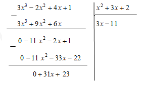 Câu 8: Tìm dư của phép chia \(A = 3{x^3} – 2{x^2} + 4x + 1\) cho \(B = {x^2} + 3x + 2\).