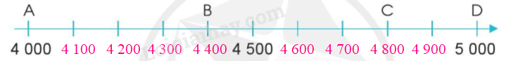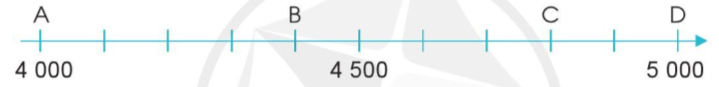 Quan sát tia số ta thấy trung điểm của đoạn thẳng AB ứng với số 4 200.