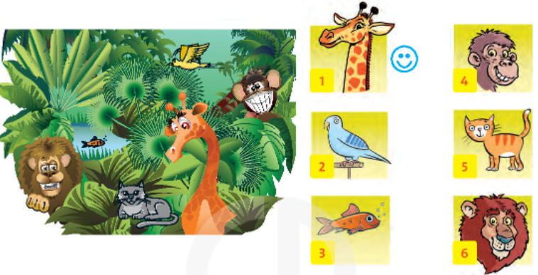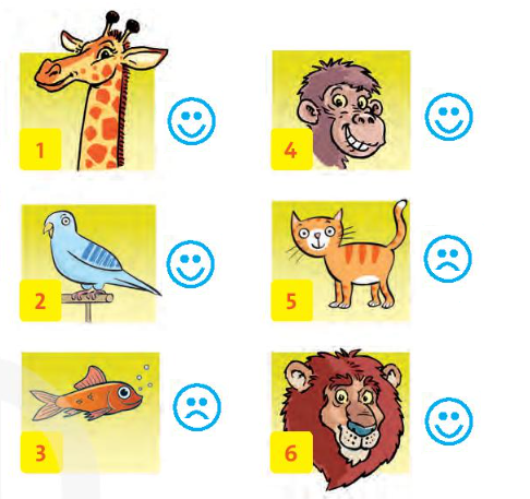 1. Listen and draw ☺ or ☹. 2. Look at the picture again. Ask and answer. 3. Talk about your favorite animals. 4. Write about animals you like and you don’t like. 5. Order the words.