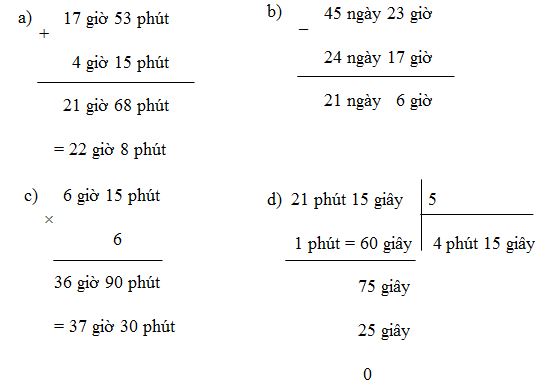 Tính: a) 17 giờ 53 phút + 4 giờ 15 phút; b) 45 ngày 23 giờ – 24 ngày 17 giờ; c) 6 giờ 15 phút × 6; d) 21 phút 15 giây : 5.