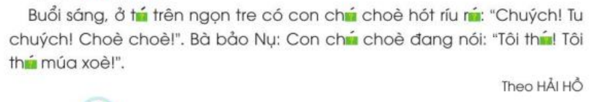 Buổi sáng, ở tít trên ngọn tre có con chích chòe hót ríu rít: “Chuých! Tu chuých! Chòe chòe!”. Bài bảo Nụ: Con chích chòe đang nói: “Tôi thích! Tôi thích múa xòe!”.