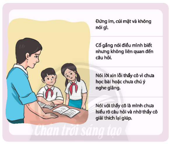 Trong giờ học, khi thầy cô gọi em trả lời câu hỏi liên quan đến bài học mà em không biết trả lời, em lựa chọn cách ứng xử nào dưới đây? Vì sao?