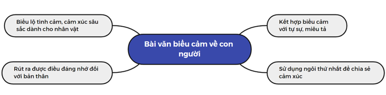 Hoàn chỉnh sơ đồ sau về đặc điểm của bài văn biểu cảm (về con người).