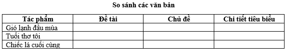 Em đã học ba văn bản Gió lạnh đầu mùa, Tuổi thơ tôiChiếc lá cuối cùng. Hãy hoàn thành bảng sau: