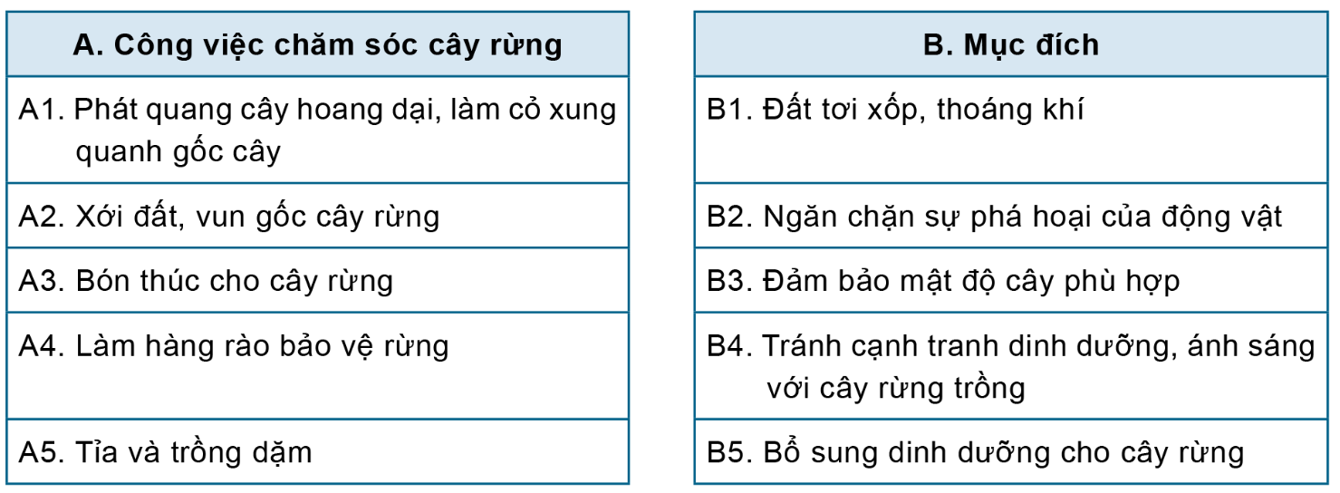 Ghép các ý ở cột A với cột B để xác định mục đích của công việc chăm sóc cây rừng.